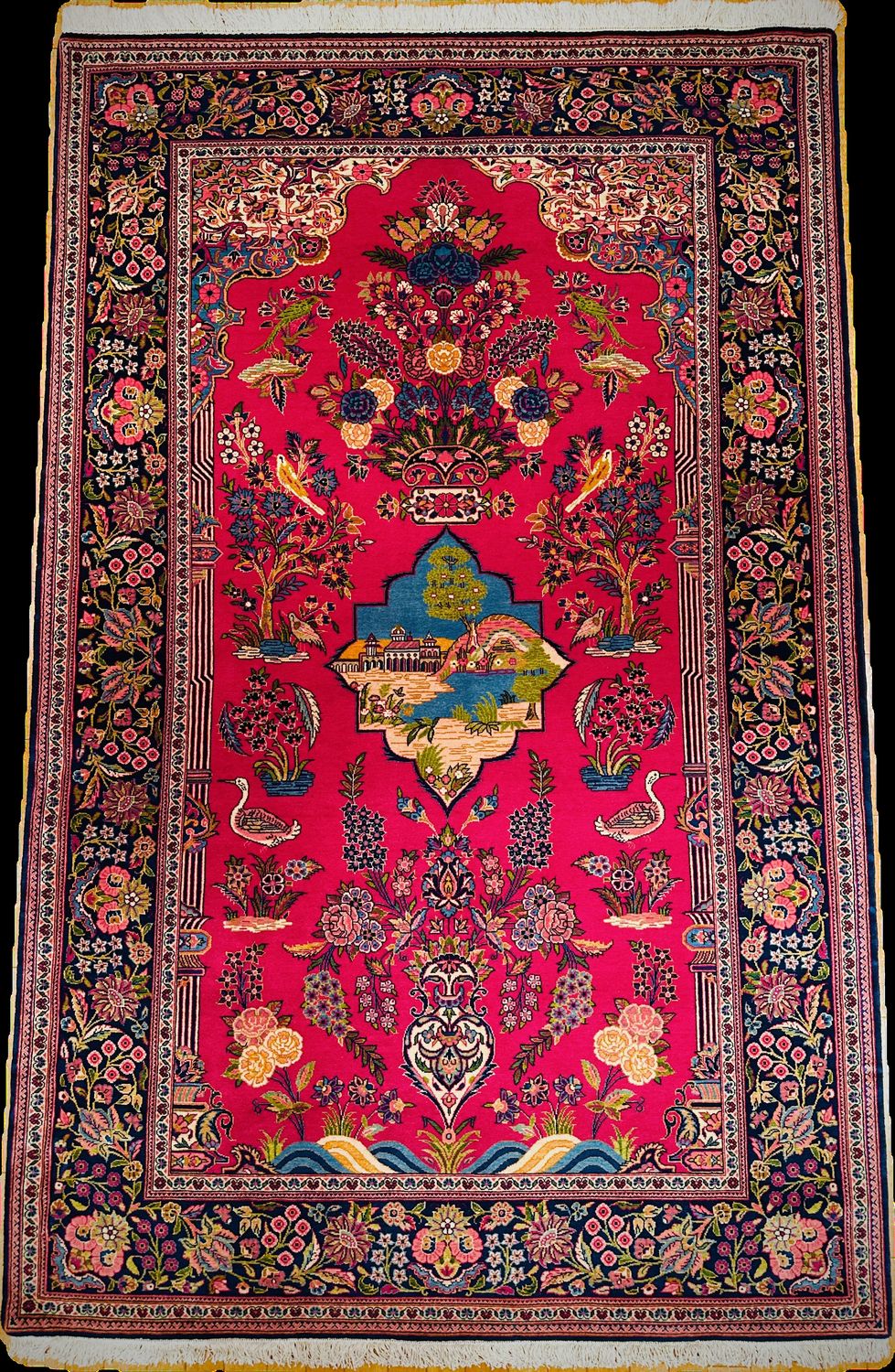 花、蔓草そしてシャーアッバス文様などを配したメダリオンコーナーデザイン(中央に大きな円形の装飾があり、その4分の1位程度の装飾が四隅に施されたデザイン)が有名です。保守的とされるこの地域の気質を反映し、古典的なデザインパターンを守り続けていてイランの家庭で広く使われています。